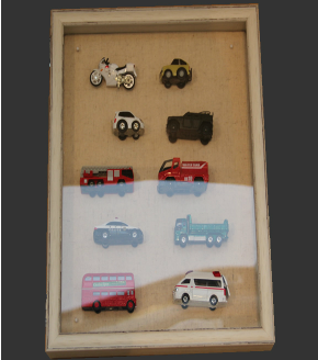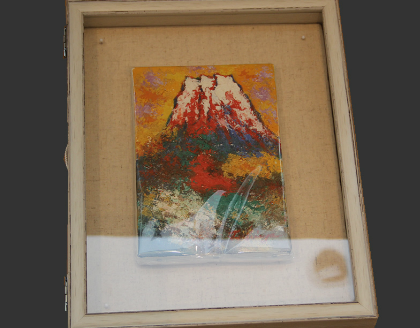 立体物は額縁に入らないと諦めていませんか? 結婚式のブーケ、紙粘土のレリーフ、海外旅行の土産品、靴、扇子、うちわ、絵皿、お面、包丁、 ホールインワンのゴルフボール、スズメバチの巣などなど、自由な発想で額縁を楽しみましょう。